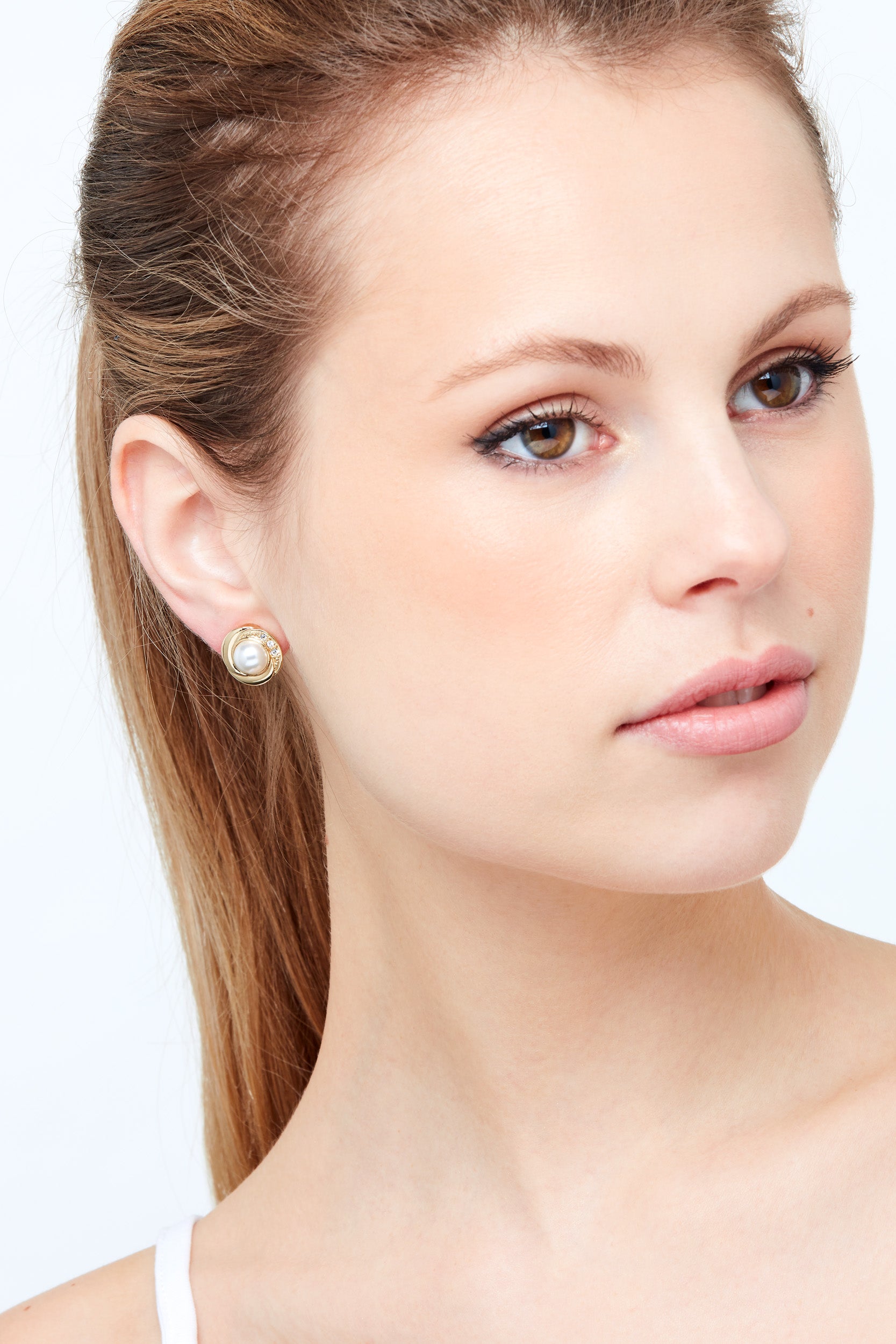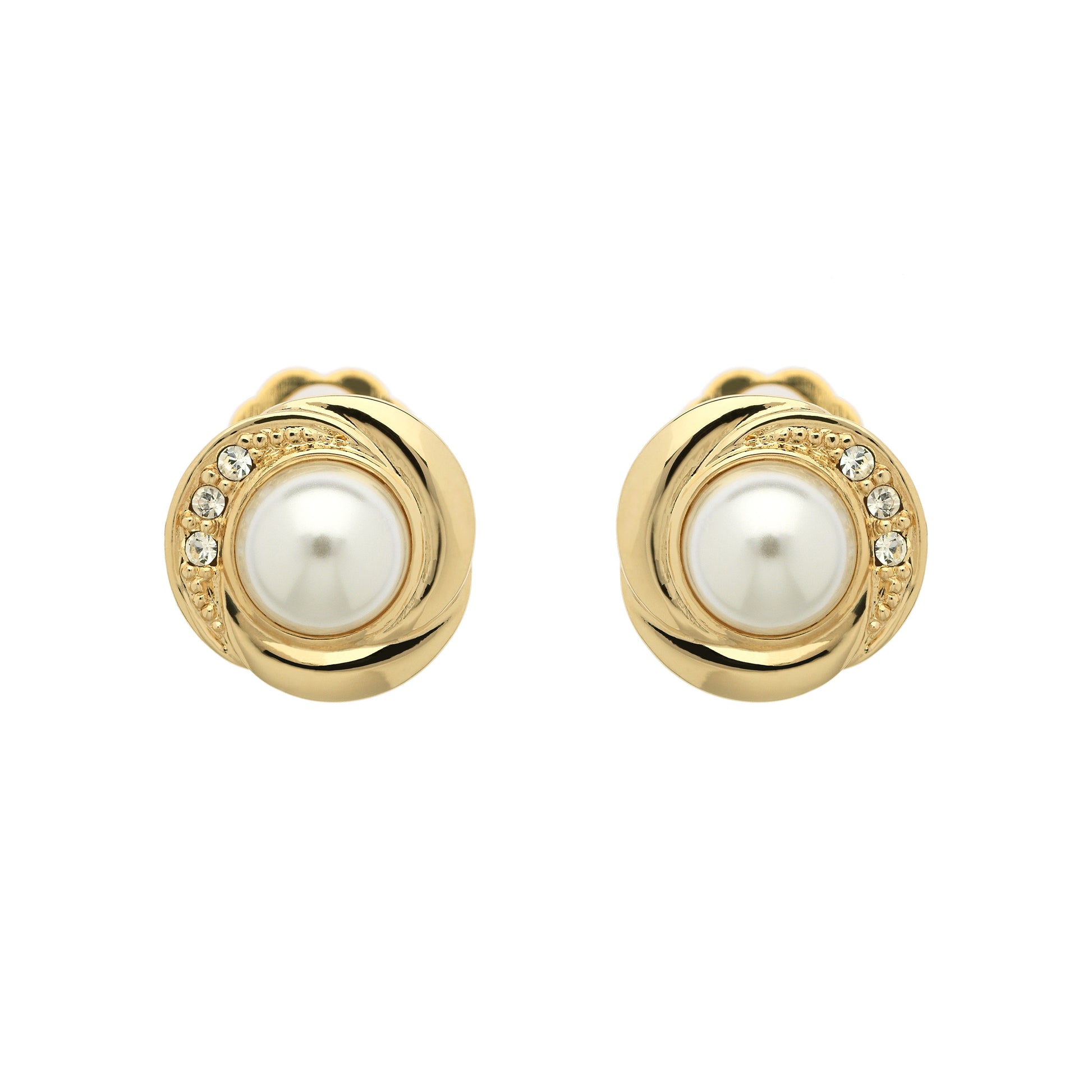 Delicate white faux pearls set in gold plated clip on earrings and finished with a trio of sparkling crystals, these elegant earrings are perfect for both day and night.