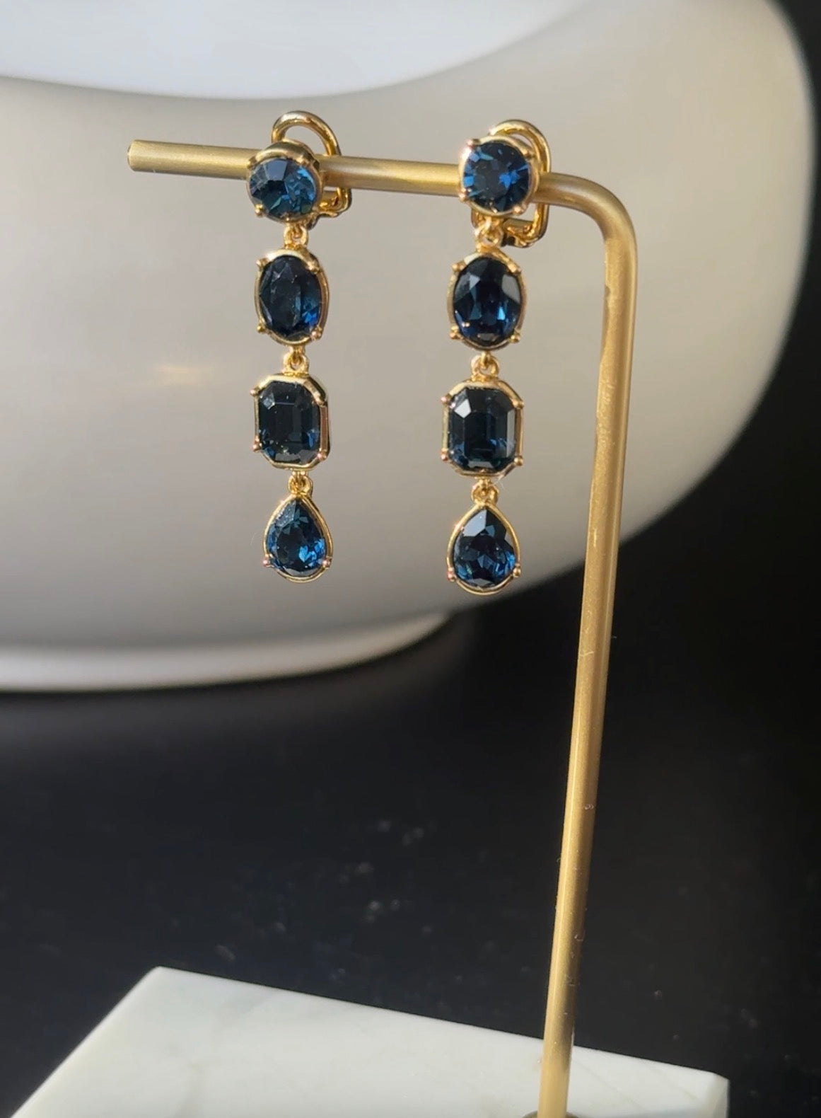 These Montana blue statement crystal clip-on earrings are designed to make an impact. Featuring rich Montana blue crystals, they bring depth and colour to any outfit while maintaining an elegant, polished look. Their bold design makes them perfect for evening wear, special occasions, or whenever you want to add a striking finishing touch.