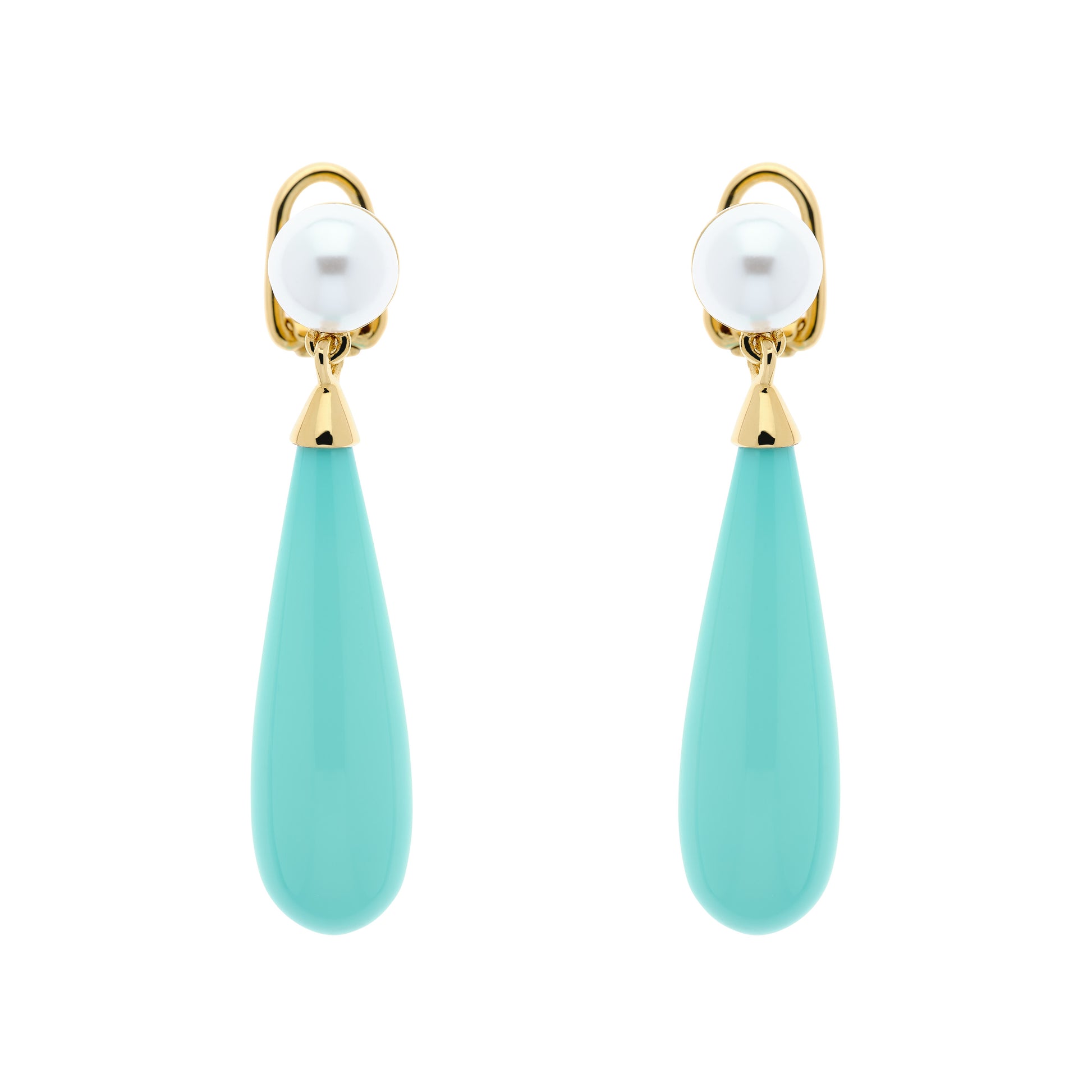 Bright & beautiful, our new faux Pearl with Turquoise resin drops set on gold plated push back clip on fastening are a gorgeous summer accessory!